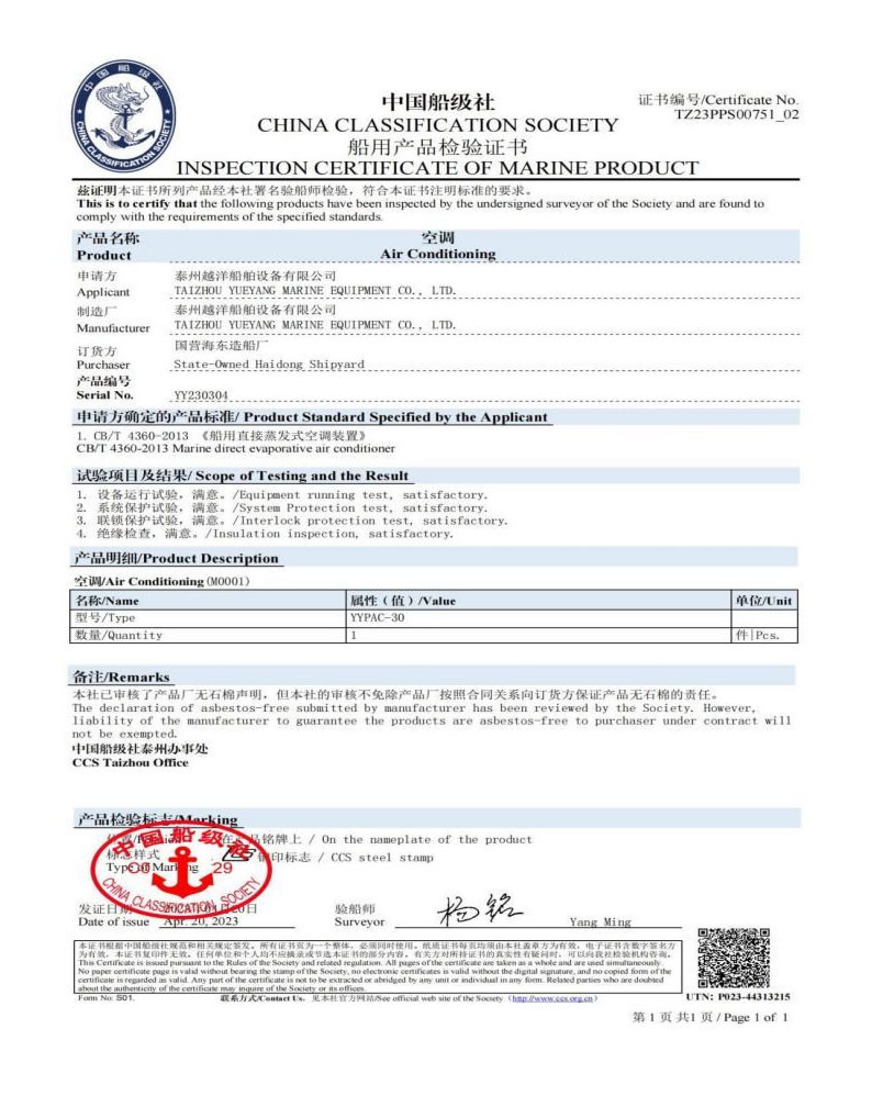 泰州越洋船舶設備有限公司多年專業從事艦船用空調、冷藏、冷凍設備、冷庫系統,通風安裝系統(空調通風,機艙通風,自然通風)等。本公司地處美麗的曲霞鎮工業園區,固定資產1200萬人民幣,占地面積1.5萬平方米左右,公司產品廣泛用于海軍驅逐艦護衛艦,補給艦,海警,醫療船,科考船等,如:“東方紅2“,“海大號”,“向陽紅06”,“向陽紅09”,“向陽紅03”,“大洋1號”,“東方紅3”,“向陽紅18”,“向陽紅52”,地質級科考船“業冶錚”號海洋平臺。
